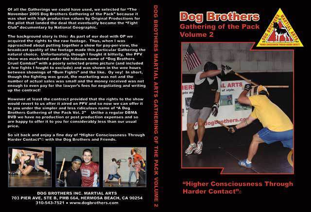 Of all the Gatherings we could have used, we selected for “The November 2005 Dog Brothers Gathering of the Pack” because it was shot with high production values by Original Productions for the pilot that landed the deal that eventually became the “Fight Club” documentary by National Geographic. The background story is this: As part of our deal with OP we acquired the rights to the raw footage. Thus, when I was approached about putting together a show for pay-per-view, the broadcast quality of the footage made this particular Gathering the natural choice. Unfortunately, though I fought it bitterly, the PPV show was marketed under the hideous name of “Dog Brothers Cruel Combat” with a poorly selected promo picture (and included a few fights I fought to exclude) and was shown in the wee hours between showings of “Bum Fights” and the like. Oy vey! In short, though the fighting was great, the marketing was not and the number of actual sales was small and the money received was not enough to even pay for the lawyer’s fees for negotiating and writing up the contract! However at least the contract provided that the rights to the show would revert to us after it aired on PPV and so now we can offer it to you under the simpler and less ridiculous name of “A Dog Brothers Gathering of the Pack Vol. 2” Unlike a regular DBMA DVD we have no production or post production expenses and so are happy to offer it to you for considerably less than our usual price. So sit back and enjoy a fine day of “Higher Consciousness Through Harder Contact”© with the Dog Brothers and Friends.