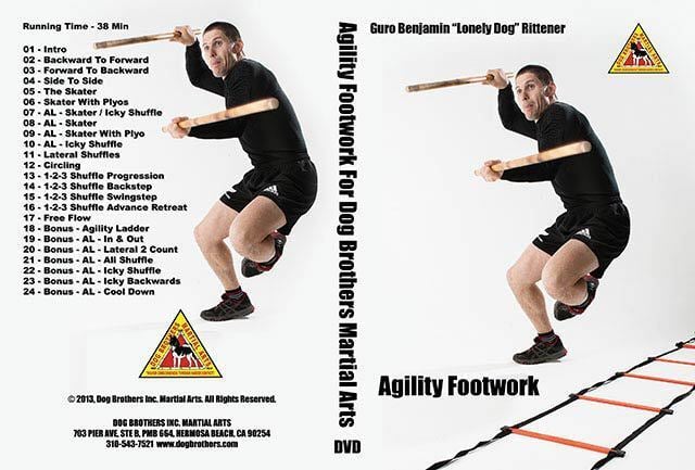 DBMA Training DVD "Agility Footwork": From the very beginning DBMA has always put a very heavy emphasis on footwork for real; be it Top Dog's amazing footwork in the second tape of the Real Contact Stick Fighting series, my "Combining Stick & Footwork" or "Dos Trique" or "Kali Tudo", or Guro Lonely's "Cycle Drills". With "Footwork Agility" Guro Lonely will show you how he trains to achieve the outstanding footwork agility he and his students display when they fight.