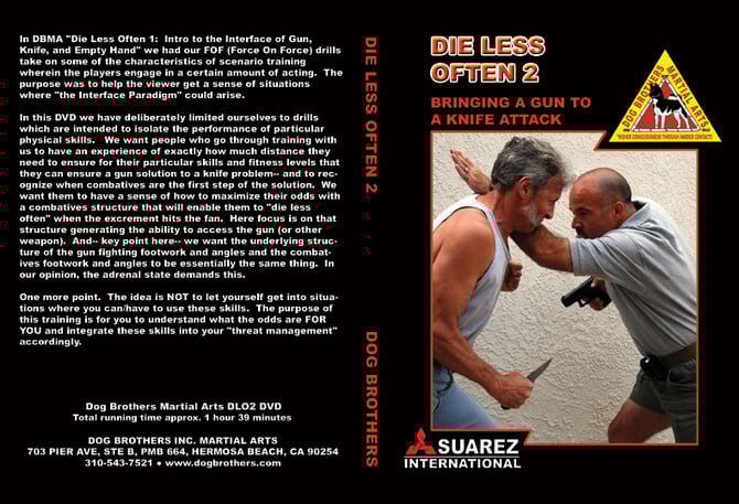 In this DVD we have deliberately limited ourselves to drills which are intended to isolate the peformance of particular physical skills. We want people who go through training with us to have an experience of exactly how much distance they need to ensure for their particular skills and fitness levels that they can ensure a gun solution to a knife problem-- and to recognize when combatives are the first step of the solution. We want them to have a sense of how to maximize their odds with a combatives structure that will enable them to "die less often" when the excrement hits the fan. Here focus is on that structure generating the ability to access the gun (or other weapon). And-- key point here-- we want the underlying structure of the gun fighting footwork and angles and the combatives footwork and angles to be essentially the same thing. In our opinion, the adrenal state demands this.